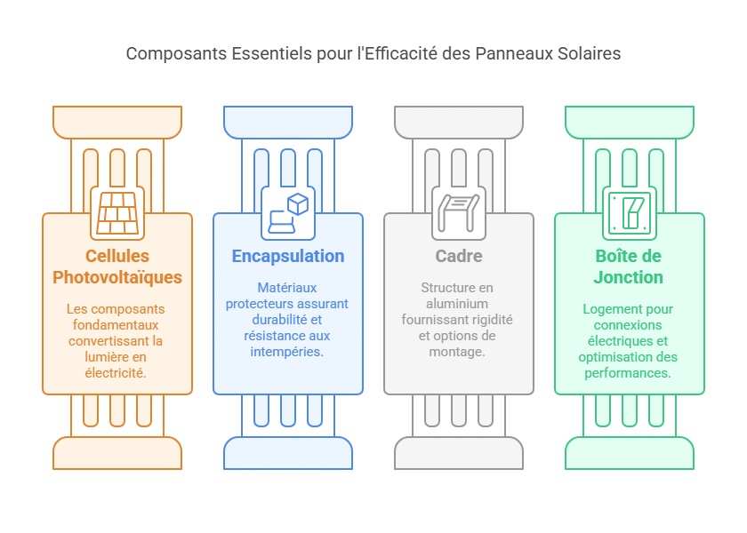 Un panneau solaire est constitué de plusieurs éléments clés qui collaborent pour capter et convertir l’énergie solaire :
